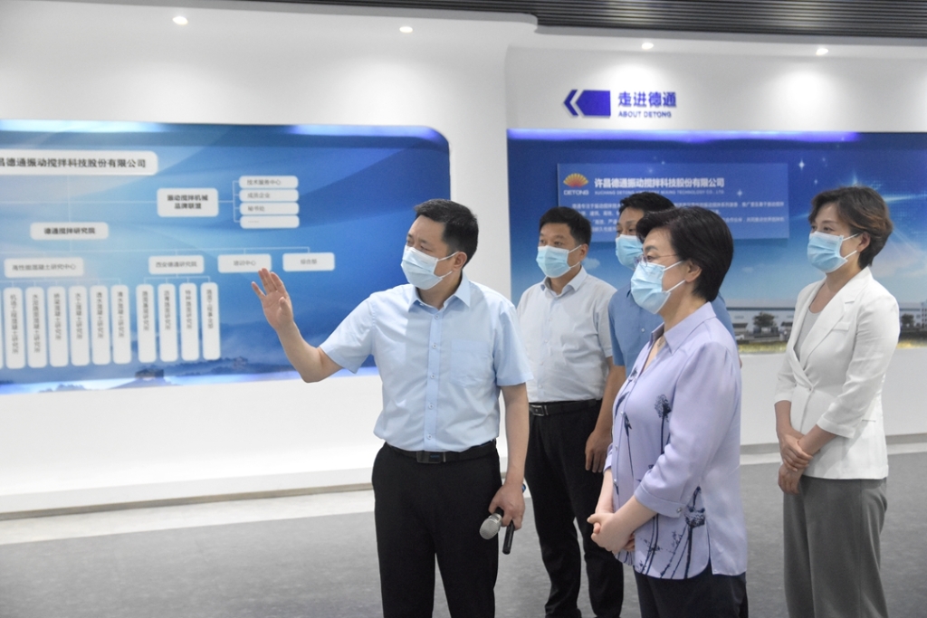 在德通數(shù)字化展廳和遠程技術(shù)服務(wù)中心,公司董事長張良奇向陳向平廳長一行匯報了振動攪拌技術(shù)、5G+攪拌行業(yè)工業(yè)互聯(lián)網(wǎng)平臺等研發(fā)成果及市場應(yīng)用推廣情況。