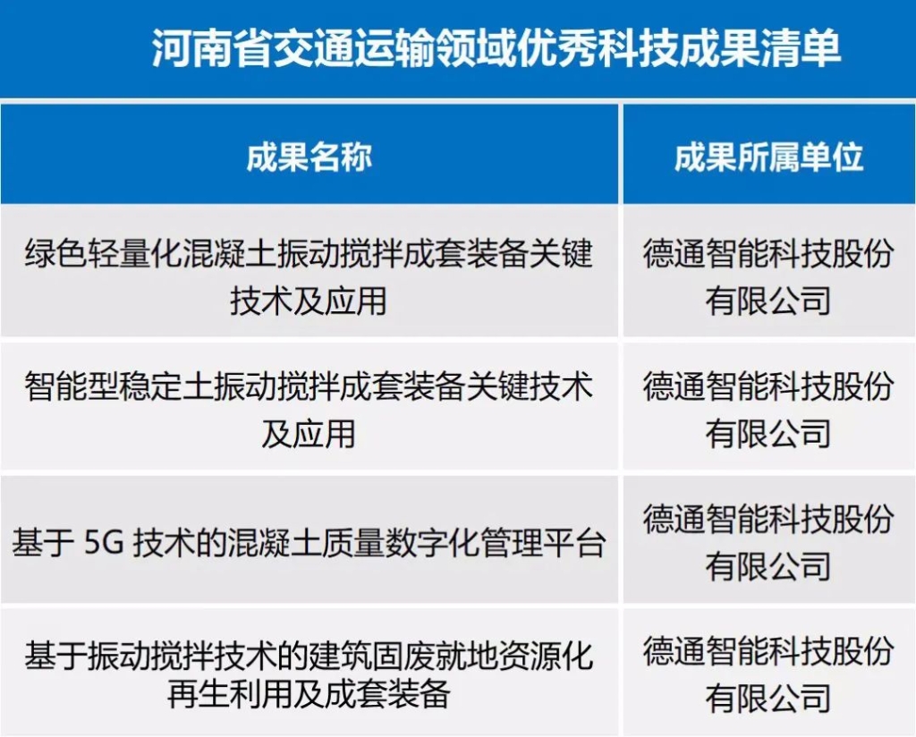 大會上發(fā)布了三十七項河南交通運輸領(lǐng)域優(yōu)秀科技成果清單,德通智能科技股份有限公司的《綠色輕量化混凝土振動攪拌成套裝備關(guān)鍵技術(shù)及應(yīng)用》、《智能型穩(wěn)定土振動攪拌成套裝備關(guān)鍵技術(shù)及應(yīng)用》、《基于5G 技術(shù)的混凝土質(zhì)量數(shù)字化管理平臺》、《基于振動攪拌技術(shù)的建筑固廢就地資源化再生利用及成套裝備》4項技術(shù)成果列入河南省交通運輸領(lǐng)域優(yōu)秀科技成果清單。